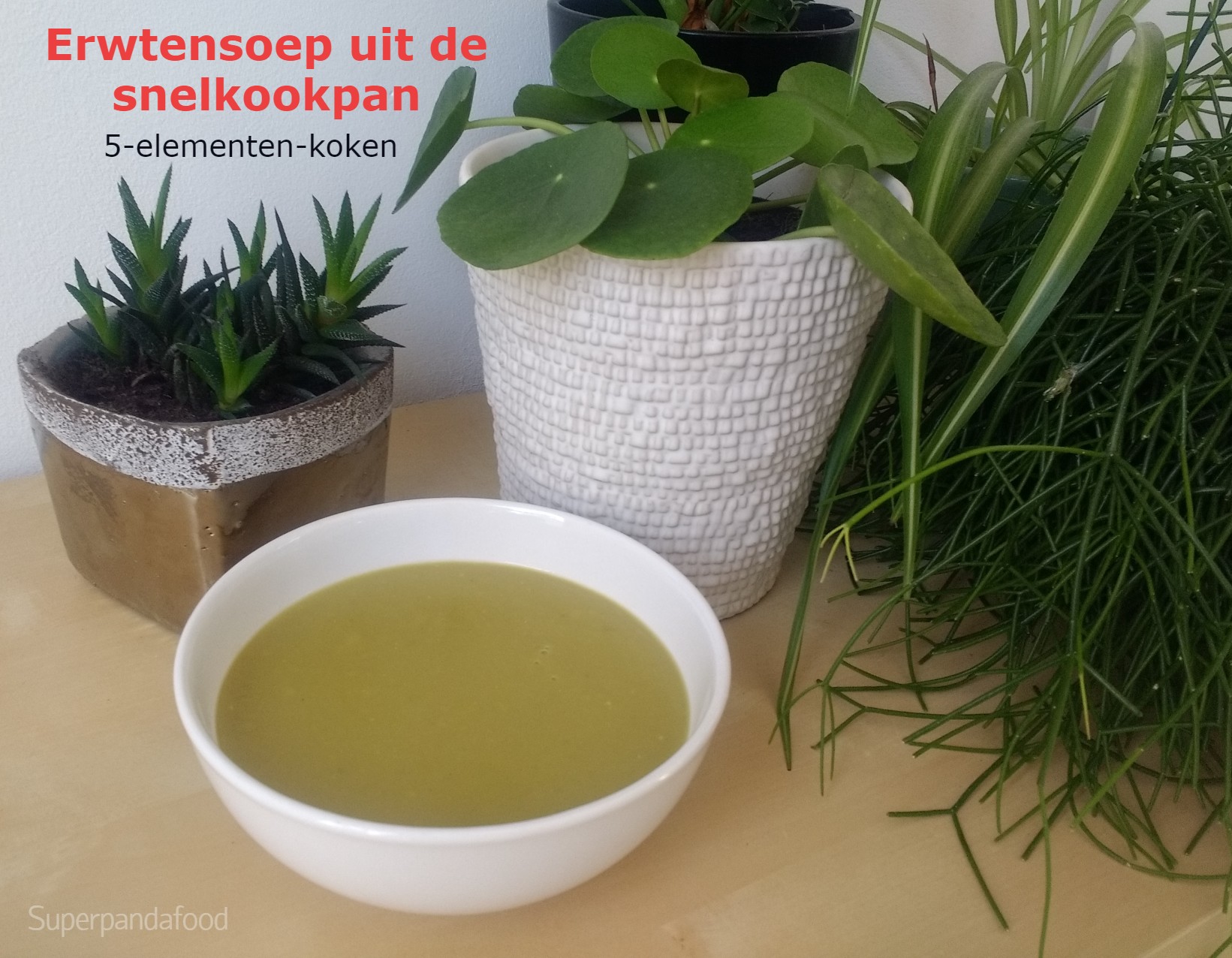 Spliterwten zijn rijk aan proteïnen, ijzer, vitamine K en foliumzuur. Volgens de Traditionele Chinese geneeskunde hebben ze een vochtafdrijvende werking en versterken ze maag, milt en yin. Deze soep is klaargemaakt volgens het 5-elementen-principe. Dat wil zeggen dat alle 5 smaken aanwezig zijn en alle 5 orgaangroepen ondersteund worden. Als je volgens de 5 elementen kookt, moet je de ingrediënten in de juiste volgorde toevoegen en even roeren en wachten na elk ingrediënt.